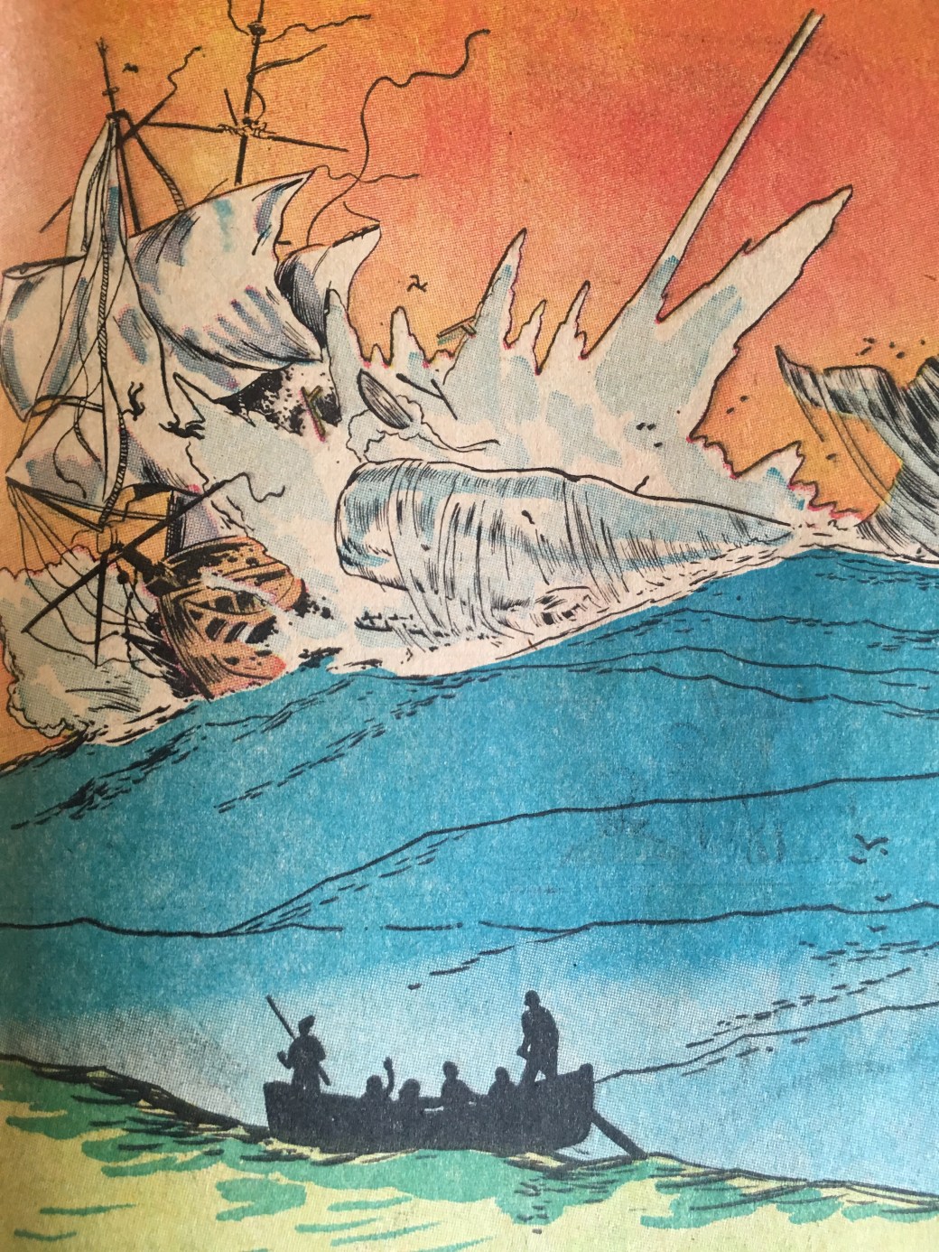 From there the Essex traveled 600 miles westward to the Galapagos Islands to hunt tortoises—a succulent and much-needed source of protein on their long voyage. These 80-pound animals were captured alive and could remain so for up to a year without further nourishment or water aboard the ship. After harvesting 280 of these creatures, an incident of incredible capriciousness and waste occurred. A white sailor by the name of Thomas Chappel lit a brushfire as a prank. The blaze quickly spread out of control decimating the island of life and transforming it into a blackened wasteland. Given the wrath nature would soon inflict on these sailors and ever the unrepentant English major, I can’t help but be reminded of Samuel Taylor Coleridge’s “Rime of the Ancient Mariner” in which a ship’s sailors find themselves doomed after an albatross is shot for no practical reason. “Water, water everywhere nor any drop to drink” was soon to be a problem confronted by the Essex crew.