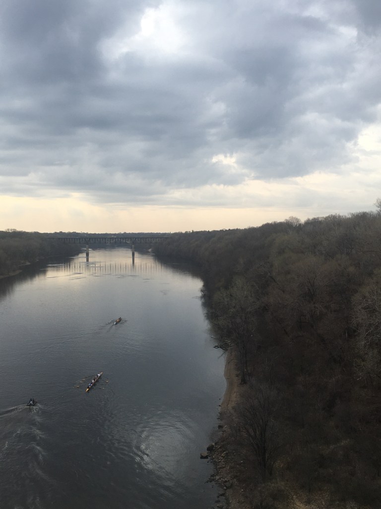 I paused on my bicycle ride across the Franklin Bridge because I spotted a small patch of white in the bare trees that I immediately recognized as a bald eagle. Far below in the Mississippi River, teams of scullers rowed downstream toward the Short Line Bridge and the Lake Street Bridge beyond that. The eagle, in that moment, seemed so powerful to me, so regal with its quiet stare. The bald eagle is an apex predator. It has no reason to hide. The crows may pester it but they cannot do it harm. Its only enemy is us–our lead and our pesticides. But the bird has no knowledge of these things. It will never be inoculated from invisible viruses. It will live in freedom until it is dead, and along the way it will nurture some offspring to keep the cycle and the species going. I pray no DNR employee has ever placed a metal band on this eagle’s leg with a serial number. This eagle has no name. It is one with its environment, observing it all with a deadly silence that I envy because I am plagued by so many words, words, words that I can’t help but write down when I should just shut up and be.