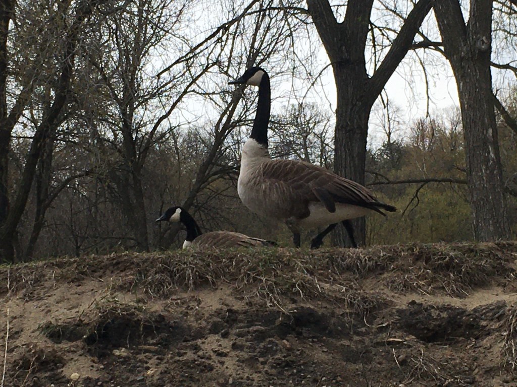 Each day the trees along the river seem to burst with more color. The drabness of winter is turning to spring. I went fishing today at Hidden Falls Park and didn’t catch a darn thing. Except for this photograph—a mating pair of Canadian geese. I was glad I went. It kept me human. And that’s more of a struggle than it should be these days.