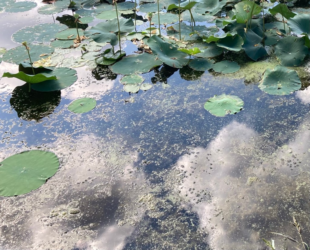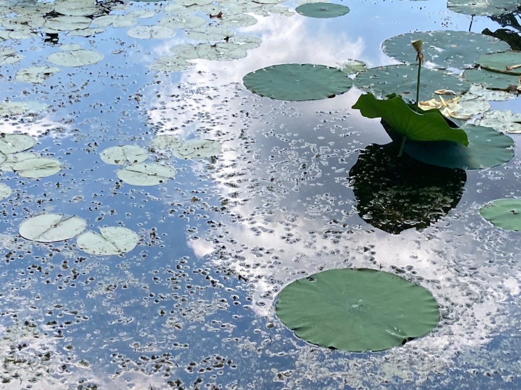 I stared into the water, lost in the stillness of the lily pads and the clouds, and took photographs with my phone as my son bunny hopped around in the shade of the bridge. Monet’s oil painting, “Reflections of Clouds on the Water Lily Pond,” is worth tens of millions of dollars and hangs behind protective glass in the Museum of Modern Art (MoMA). Someday I will have to visit New York City and see it. But for now, nature and my pedaling legs will have to suffice.