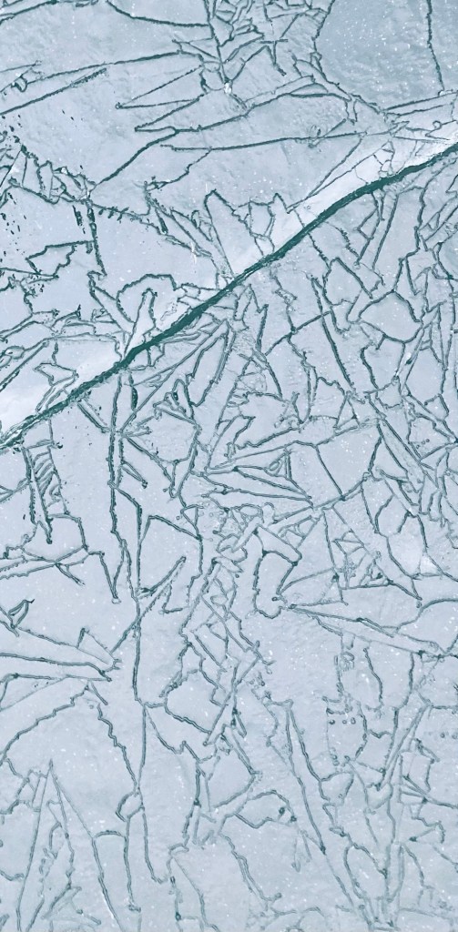 I checked the time on my phone and glumly decided to call it quits. I didn’t want to be late for work. Before departing the lake, I took pictures of the frizzled mosaics that nature’s Etch-a- Sketch had created in the ice.